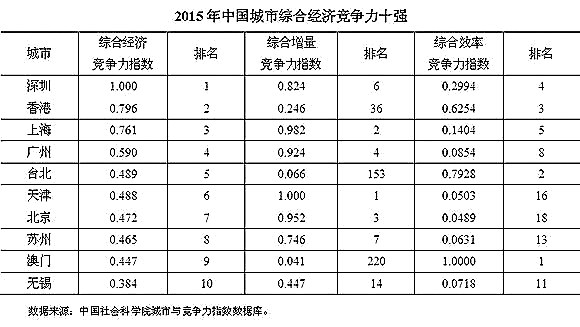 昨天下午,中国社会科学院财经战略研究院、中国社会科学出版社与中国社会科学院城市与竞争力研究中心联合在京发布了2015年度城市综合经济竞争力和可持续竞争力前十强城市榜单。深圳、香港、上海、广州、台北、天津、北京、苏州、澳门和无锡位居2015年综合经济竞争力指数十强。