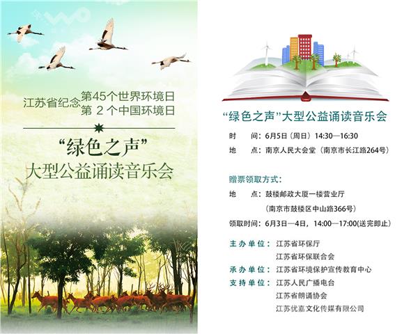 荔枝新闻记者我今天(6月1日)从江苏省环保厅获悉,作为今年“六五环境日”的重点活动之一,“绿色之声”大型公益诵读音乐会将于6月5日下午14:30在南京人民大会堂举行。6月3日到6月4日每天下午14:00到17:00,公众可以到鼓楼邮政大厦一楼营业厅领取免费门票。包括江苏广电总台主持人在内的朗诵名家将精彩献艺!
