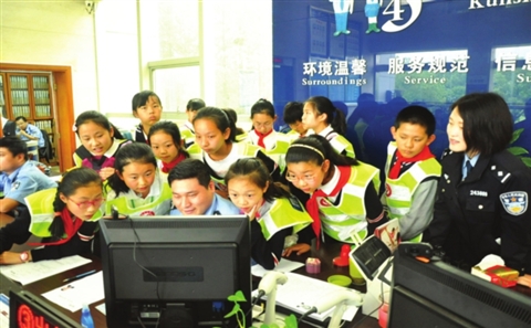 “您好,请问您需要办理什么业务?”5月21日,市民李先生前往昆山市公安局长江派出所申办护照时,惊奇地发现当天协助办理业务的竟是一名十多岁的小女孩。原来,这是该所在六一儿童节来临之际向辖区小学开展警营开放体验活动,该校十多名学生在老师的带领下走进警营,体验了一回“小小户籍警”。