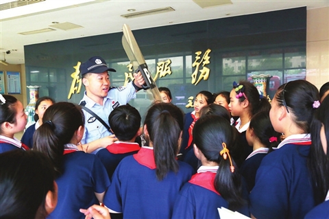 虎丘公安分局枫桥派出所民警在向参观警营的孩子们演示警械使用方法。