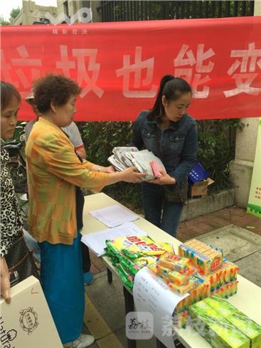 上午9点多,在玄武区城开御园的西大门,近百位居民手里拿着一叠叠旧报纸、可乐瓶和易拉罐等,参与社区开展的垃圾积分换物活动。记者在现场见到,1斤旧报纸、书或纸箱为1个积分,10个易拉罐、瓶或电池为1个积分,废油漆、农药或其他可回收垃圾1斤为1个积分。参与活动的居民只要积满6分,就可以得到洗衣粉一袋。积满3分可以得到抽纸或香皂一份,积满4分可得到消毒液一份。