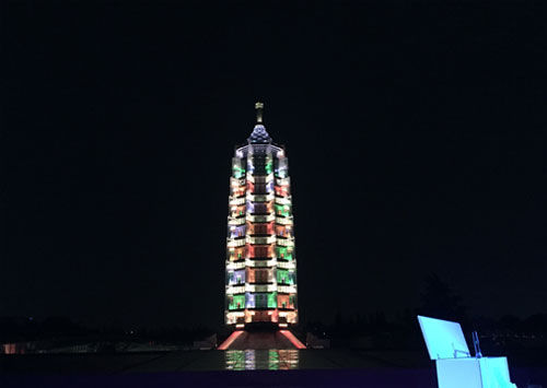 《妙法莲华经》中讲:“乃至童子戏,聚沙为佛塔。”现场的孩子们在活动的结尾拿起手中祈愿瓶里的彩砂,用它们填满沙盘上的塔,象征着不捐细流、聚沙成塔。6声悠扬的钟声中,大报恩寺塔被逐层点亮,变成了一座充满童梦的七彩琉璃塔,此时东风小王子也乘风而来,带来穿越百年的对童心的呵护。