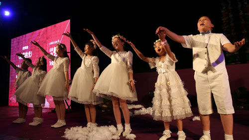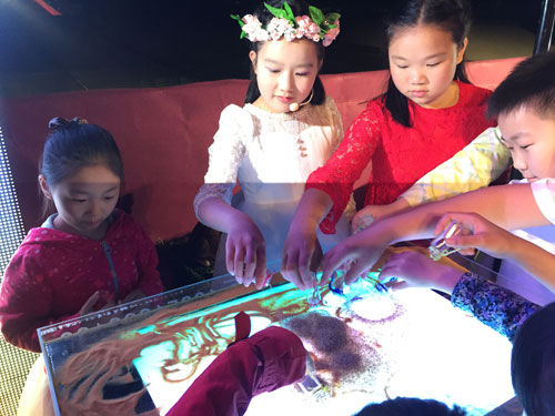 在梦幻的“天国花园”中,来自各学校和艺术团的小朋友表演了钢琴独奏巴赫《前奏曲》、诗朗诵《感恩的心》、小合唱《最美的光》等节目。沙画艺术家王露用优雅的笔触在现场演绎了安徒生的美丽童话——《天国花园》。