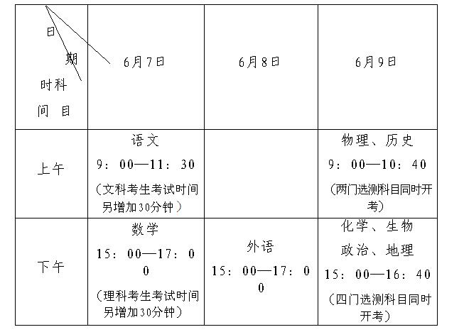 2016年普通高等学校招生全国统一考试和学业水平选测科目考试于6月7日至9日举行。考试时间具体如下: