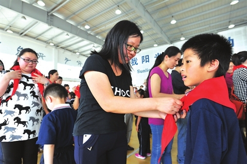 昨天,阳光城实验小学为一年级的孩子准备了特别的“六一”节礼物——一场特别的入队仪式,由爸爸妈妈亲自为孩子戴上红领巾。