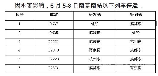 6月4日下午,铁路南京站发布“关于水害影响南京南站部分列车停运的通告”。因水害影响,6月5-8日南京南站仍有6趟列车停运。(见图)