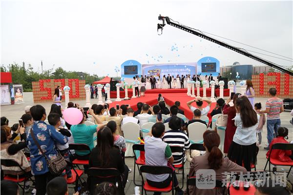 活动当天,沭阳南湖公园南门人山人海,现场气氛热烈喜庆。10位帅气的新郎手捧鲜花,向10位美丽的新娘求婚,现场浪漫又梦幻,吸引了上千市民围观喝彩。在嘉宾和观众的见证下,10对新人交换戒指、宣誓承诺、喝交杯酒,相互拥吻,正式结为夫妻。