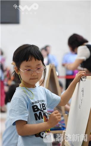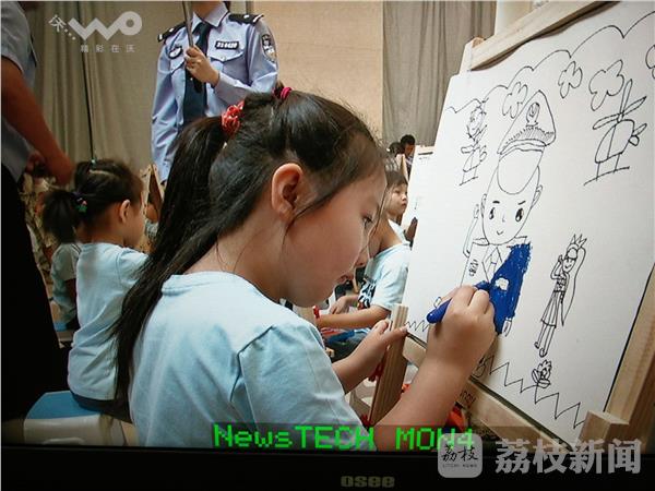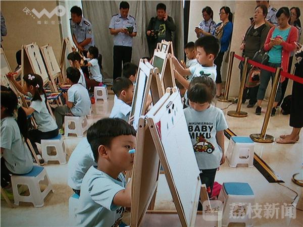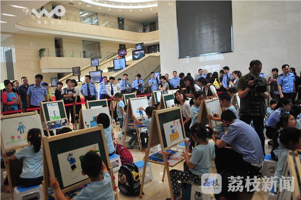 开幕式结束后,来自南京市公安局幼儿园的50名小朋友在书画区现场作画,用稚嫩的小手画出自己心目中的警察爸爸妈妈。