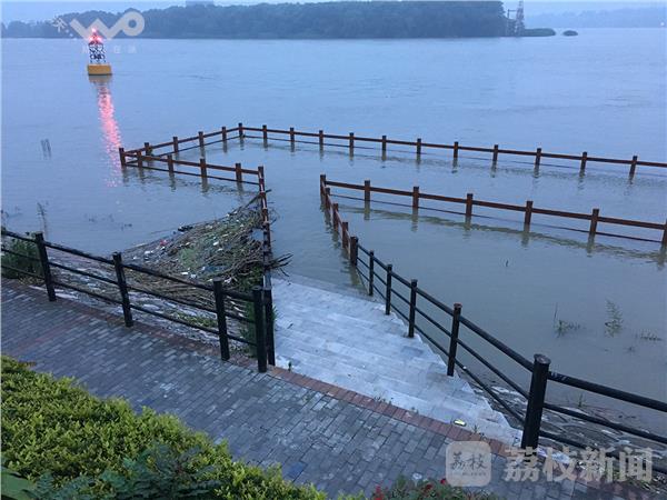 据报道,前长江流域已进入主汛期,预计6月至8月主汛期内,长江中游局部地区降雨量将比多年同期平均值多五成以上。受上游连日多雨影响,长江南京段水位猛涨,许多亲水平台淹没水中。