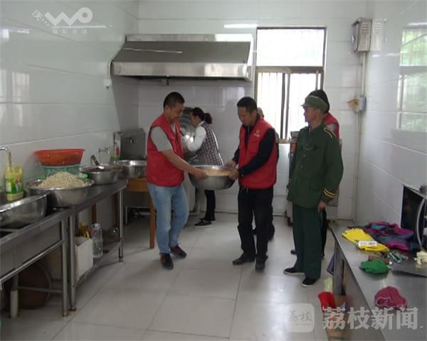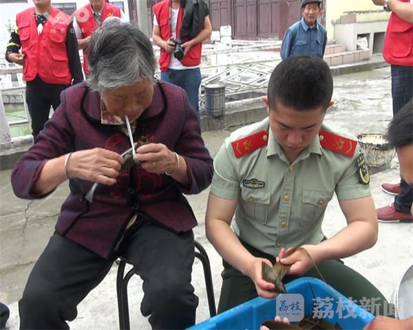 爱心人士们从车上搬下带给老人的过节礼物有粽子及其他食品,堆成一座小山。在分发礼物时,有些老人腿脚不灵敏、不能前来广场领礼物的老人,爱心成员及武警官兵帮老人把礼品送到他们的宿舍。在敬老院食堂门口,几个老人正在裹粽子,几个武警官兵同爱心成员立即上前,共同学起裹粽子。在食堂内,爱心成员成俊杰与马建付协助食堂师傅一起烧午餐,共同探讨老人饮食健康与安全。