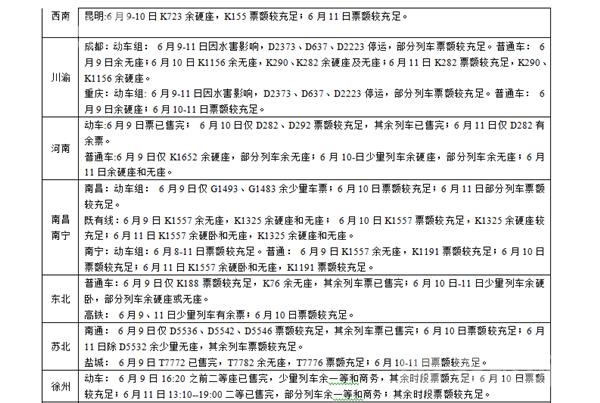 成都方向:6月9日因水害影响,D2373、D637、D2223停运。6月10-13日因水害影响,D2373、D637、D2223停运。