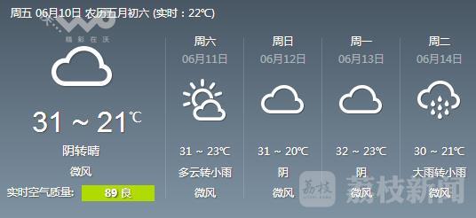 明天是端午小长假最后一天,全省多个地区将迎来降雨。沿江和苏南地区多云到阴有阵雨或雷雨,其他地区多云,局部阴有阵雨或雷雨。不过,气象台说,下雨的时间比较晚,全省最高气温都将超过30℃,人体会感觉比较闷热。