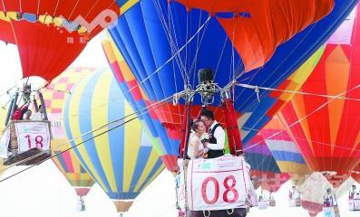 当天上午9点45分,巴布洛生态谷内,50只色彩斑斓的热气球,依次缓缓升起,每只热气球上,都载着一对甜蜜的新人。到10点钟时,所有热气球都升到了空中,离地面约有10米高,有序排成了一个方阵。热气球上,身穿白色婚纱的新娘,挽着西装革履的新郎,纷纷微笑着向游客们挥手。一对对新人从热气球上下来后,依旧兴奋不已,纷纷以热气球为背景,拍下了这一幸福时刻,大家普遍感到空中办婚礼的感觉,简直太美妙了。