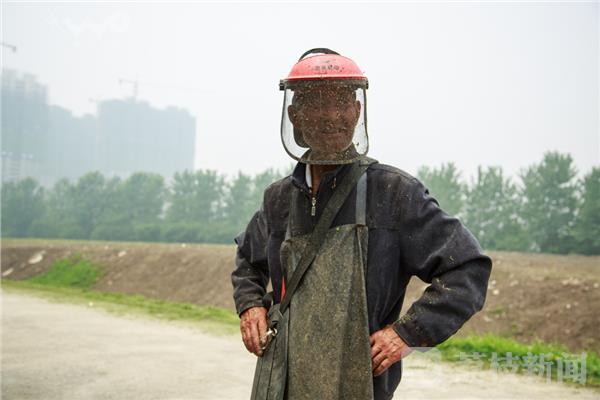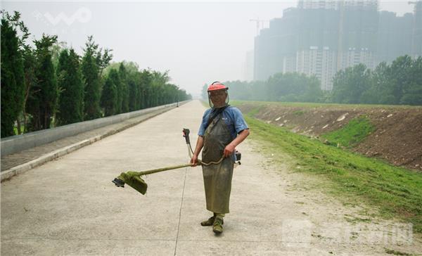 2016年6月11日上午11时许,笔者到江北威尼斯水城滨江大堤游玩,看到长江大堤两侧绿化带上,两位绿化工人穿着防护服,头戴安全帽,正在用割草机割草,“今天气温达31°是今年气温最高的一天”绿化工人说,他们是南京河道管理处绿化工人,早上6点就在这里干活,一直忙了5个小时。笔者看到,他们浑身是汗,衣服湿透,甚至能挤出水来,“天再热割草也要穿上防护服,因为青草里有蚯蚓拉的屎,太阳晒后成了很硬的泥巴块沾在草叶上,一旦被刀绳击中,会弹到自已脸上”。到了中午时间,他们坐大堤上阴凉处稍作休息,脱下上衣服,可惜一点风没有。