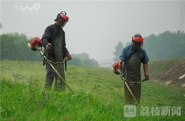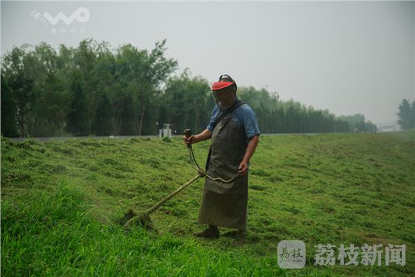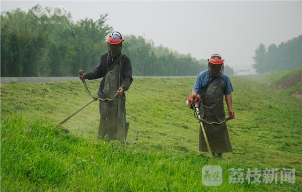 今天是端午小长假最后一天,也是南京今年最热的一天,市民有的在家休息有的到景区游玩,但是南京河道绿化工人,冒着31°桑拿天气,在江北大堤割草,浑身湿透,衣服如在水中浸泡。