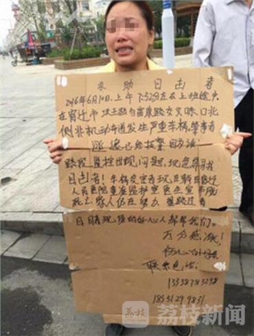 为了找到目击者,赵先生的母亲只好举着写有儿子出事经过的牌子,在事发地寻求目击者的帮助。