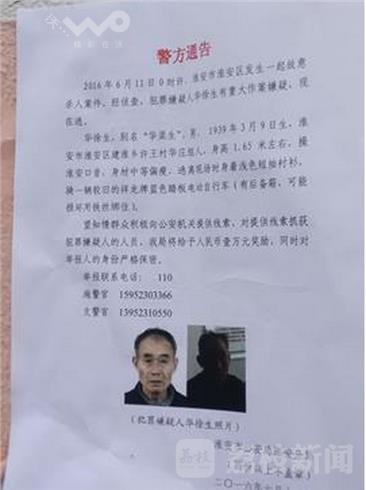 6月12日上午,淮安市淮安区公安局发布警方通告,悬赏一万元通缉“6.11”杀人案年近8旬的杀人凶手华徐生。