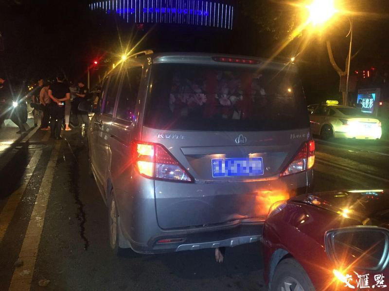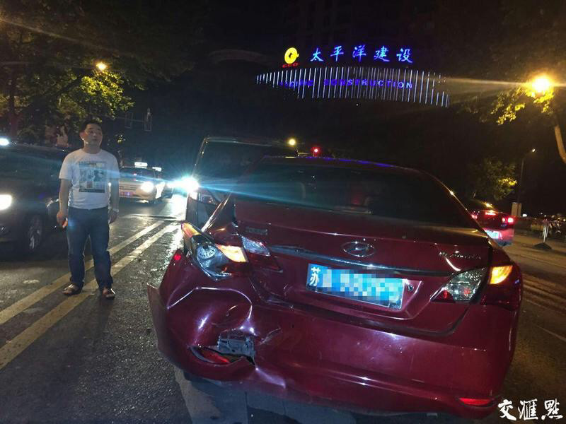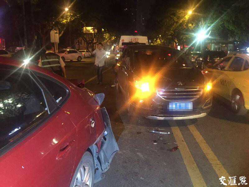 交汇点讯 6月12日晚上10点,在南京鼓楼区华侨路与上海路路口,一名女司机驾驶一辆宾利豪车从华侨路由东向西上坡时追尾标致轿车、现代轿车、长安面包车。 (来自:新华报业网)