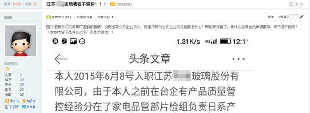 前几天,一篇标题为“江苏**玻璃我看不懂你”的帖子在宿迁当地论坛热传,李先生在帖中介绍了自己因为在朋友圈发了几句工作上的“牢骚”,而“被辞职”的遭遇,引起关注。