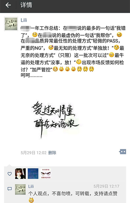 在一条标题为“一年工作总结”的朋友圈信息中,李先生如此写到:说的最多的一句话是“我错了“,说的最虚伪的一句话是“我帮你”,在品质异常最任性的处理方式是“轻微的pass,严重的NG……”