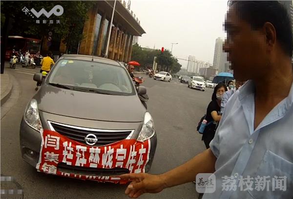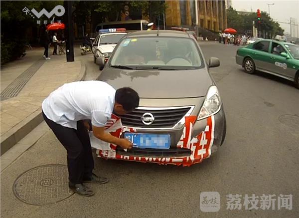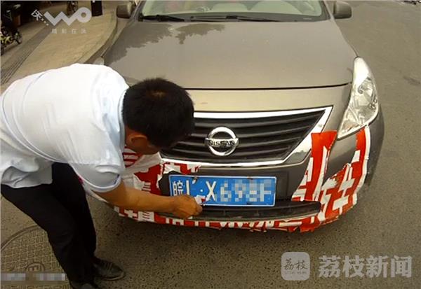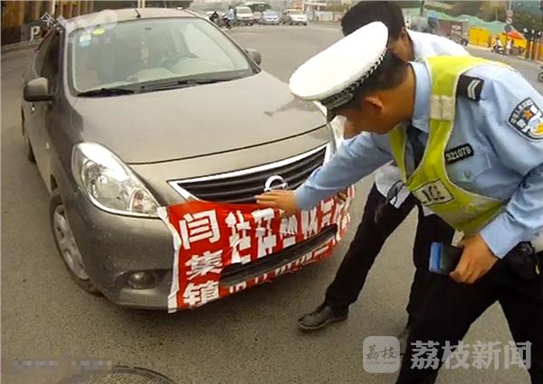 6月13日中午,徐州泉山交警在淮海西路苏堤路口值勤时,发现这辆轿车前车牌照全完被遮挡,民警将其拦下对其进行检查。发现其车前张贴的是一大副“禁烧秸秆”宣传标语,但是其张贴的位置,刚好将整个前车牌完全遮挡。
