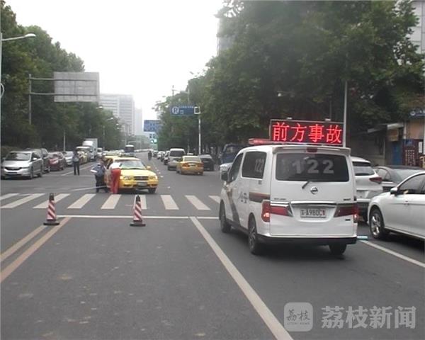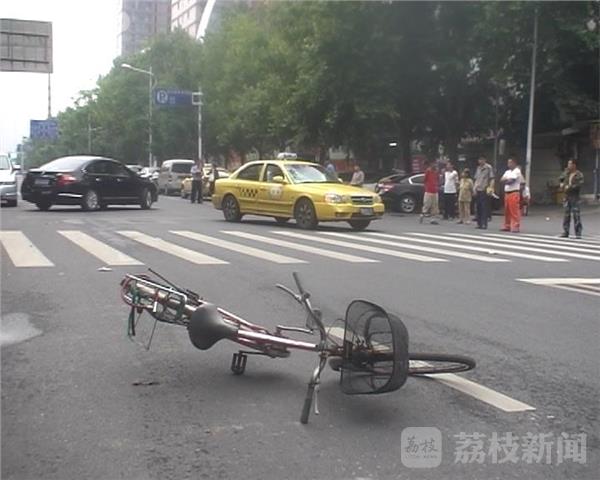 荔枝新闻记者赶到现场时,被撞的骑自行车女子已经被救护车送到省人民医院救治。现场可以看到女子的自行车倒在马路中央,地上有一滩鲜血,出租车挡风玻璃破裂。司机王某称,女子骑自行车出公寓大门口左转弯速度快,自己避让不及才撞到她。