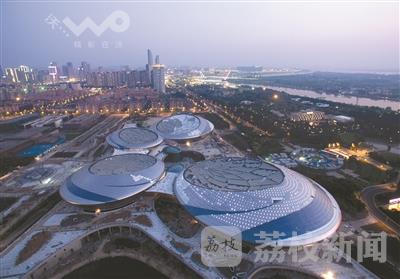 荔枝新闻记者从江苏省政府获悉,16日晚,位于南京河西奥体中心西侧江苏大剧院的四滴“水珠”进行灯光调试。本月底江苏大剧院将基本完工,10月左右开始试运行。