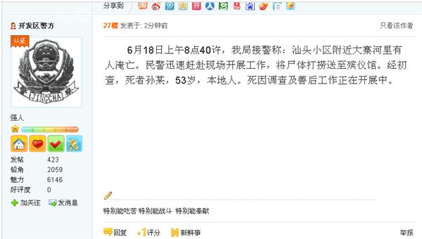 中午12点多,淮安开发区警方在淮安网论坛上发布警方通告,“6月18日上午8点40许,我局接警称:汕头小区附近大寨河里有人淹亡。民警迅速赶赴现场开展工作,将尸体打捞送至殡仪馆。经初查,死者孙某,53岁,本地人。死因调查及善后工作正在开展中。”
