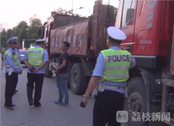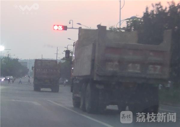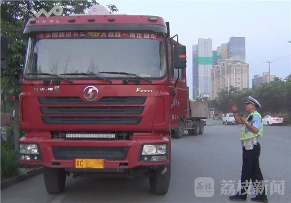 6月18日晚上7点多,徐州鼓楼交警大队民警在荆马河路上发现两辆大货车,由东向西闯红灯飞速行驶,民警立即拉响警报,示意驾驶员靠边停车接受检查。