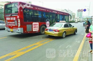 荔枝新闻记者从交警九大队获悉,浦珠中路服装城门口的公交车站台是一个比较大的站台,客流量很大,一些出租车司机看中了这块“风水宝地”,总是在公交站台违停候客。有时,公交车只能停在行车道上下客,存在交通安全隐患。