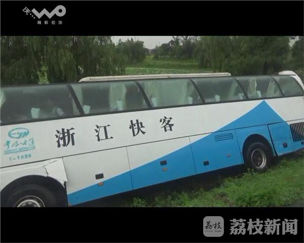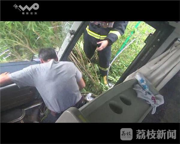 6月20日下午一点半,苏嘉航杭苏线吴江出口匝道附近,一辆大客车翻进高速路路沟内,有8名乘客和1名司机被困。