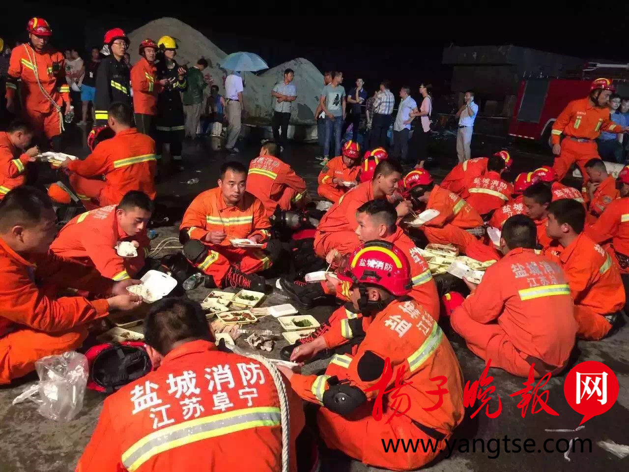 据了解, 当天下午,接到灾情报告后,江苏省消防总队迅速启动应急救援机制,调集临近的盐城、淮安、扬州、连云港、南京及总队培训基地共56辆车357人,以及南京士官学校7辆车160人赶赴现场救援,其中包括2个重型地震救援队,4个轻型地震救援队,1个搜救犬队。当晚10点前后,盐城、淮安、连云港、南通等地消防管斌已经赶到灾区,深入一线展开了救援。到晚上,无锡消防也受命紧急出动增援,镇江消防整装待发。