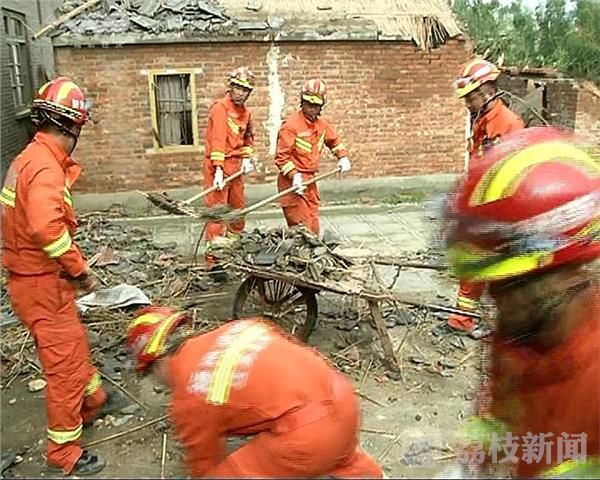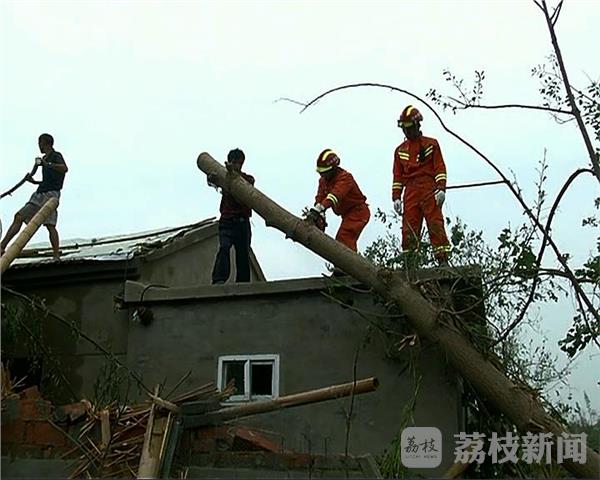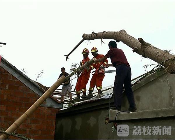 村民王大爷今年65岁,龙卷风袭来时,他和老伴都没在家,侥幸逃过一劫。人没事,但王大爷家的房子却遭了秧,厨房的屋顶被龙卷风整个掀飞,卧室的房梁也塌了。老人忧心忡忡,院子里铺满了碎砖烂瓦,满屋子的稻谷没有地方晾晒,搞不好就要发霉变质了。了解了王大爷的困难后,扬州消防支队的官兵立即行动了起来。一时间,扫地的扫地,搬砖头的搬砖头,扛房梁的扛房梁,官兵们都忙得热火朝天。二十分钟后,王大爷家重新恢复了整洁。吴阿姨今年53岁,是王大爷的邻居,一棵被龙卷风吹歪的大树悬在他们家屋子的上空,让人十分担心。扬州支队的消防官兵二话不说,立即带着电锯爬上屋顶,冒着危险,行走在破损的墙头,对倒伏的大树进行切割。十分钟后,这棵大树被安全的锯成好几截,不再对周边房屋产生危害。
