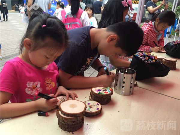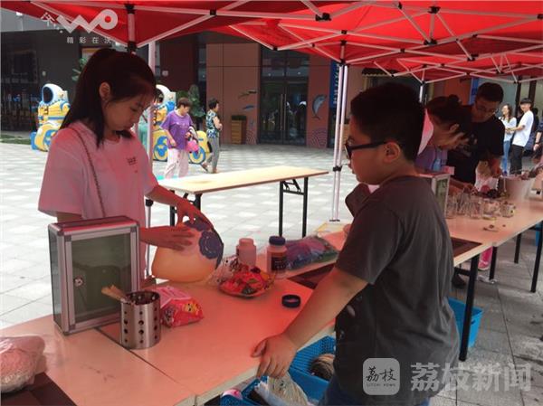 爱心创意亲子市集,每周末都在南京世贸滨江商业街区举行,这里集合了文创、游戏、美食等数十个摊位。其中,文创摊位人气最旺,孩子们通过购买爱心券,进行制作蜡烛灯、麻绳变灯罩、原木杯垫等各种体验。
