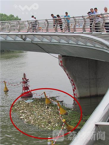 当日中午,笔者来到南京外秦淮河入江口的三汊河河口闸,滚滚江水与内河水连成一体。由于近期梅雨季节,外秦淮河水猛近与长江水位持平。然而,发现红云桥上围着许多路人,一边散步一边欣赏江边的风景,突然飘来一股腥臭味。仔细一看,桥下漂浮着成片的死鱼,死鱼上几只小鸟啄着死鱼。这些死鱼中有鲫鱼、鲢鱼,还有垃圾,站在桥上就能闻到一股臭味,死鱼随着长江浪涛拍打,不停地流入长江,污染环境。据了解,外秦淮河内每天有不少打捞船打捞死鱼垃圾,还是有漏网之鱼没有及时清理,顺着波浪流入长江。徐福庚 摄