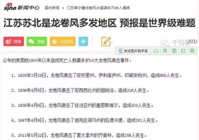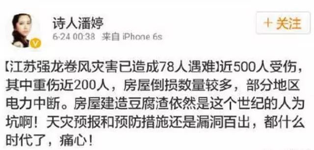 “据中央报道,江苏省盐城市阜宁县受强暴雨影响遭遇12级龙卷风,目前看来这是我国有史以来受强暴雨影响最大一次。据统计,截至6月23日17时38分阜宁死亡人数正不断上升,目前死亡321人,重伤842人,还有32人至今下落不明。”