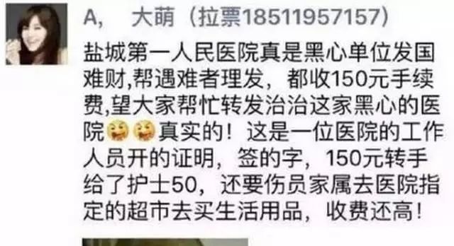 盐城第一人民医院对受灾遇难者理发,每人收取150元手续费,其中50元提成给护士。伤员家属要到指定超市购买生活用品。