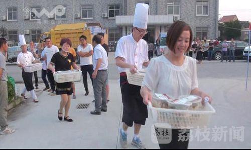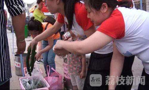 在射阳县陈洋办事处的门口,荔枝新闻通讯员看到一队服务员正用托盘将盒装的热饭菜送到这里。这里是射阳灾区接受捐赠物资的一个接收点,有工作人员和志愿者在这里接收、配送救灾物资,由于人手少、配送任务重,他们不能及时吃上可口的饭菜,有时只能随便吃点饼干和面包。打开盒饭可以看到,里面装的是青椒木耳炒肉丝和白米饭,还冒着热气。射阳某酒店的老板茆万鹏称,在得知灾区需要热饭菜的信息后,酒店全体员工放弃休息时,加班加点赶制了五百份的盖浇饭,并及时送了过来。在洋北大桥的北侧路边上,一群身着统一服饰的志愿者正在给过来的灾民盛装绿豆汤,并配送新鲜黄瓜。正在盛装绿豆汤的一名志愿者告诉记者,她们是一家教育机构的工作人员,因为今天的气温高达三十度左右,就采购了绿豆和新鲜的黄瓜,熬制了绿豆汤,送到抢险救援的现场,免费供灾民和抢险救援人员免费领用,为他们防暑降温尽一点绵薄之力。