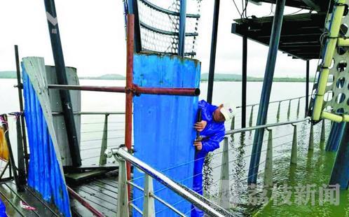 蠡湖风景区的情况比较严重,9.5平方公里区域内已经有10多处地方不同程度受淹,水深处达50厘米。昨天上午,当蠡湖水位超过4米时,平时游人最集中的百米高喷木栈桥受淹严重。为避免游人不知深浅在此戏水,应急保障队立即动用彩钢板、脚手架,对桥面两端进行全封闭(左图),挂上警示牌。由于雨不停地下,包括渤公岛荷花港、承露台、渔父岛蠡堤、金城湾凤凰岛、长广溪湿地公园等10多处沿湖区域受淹。在26个入湖河道口,景区准备了5000个沙袋应急备用,同时两台大型水泵进行动力强排,以降低蠡湖水位。