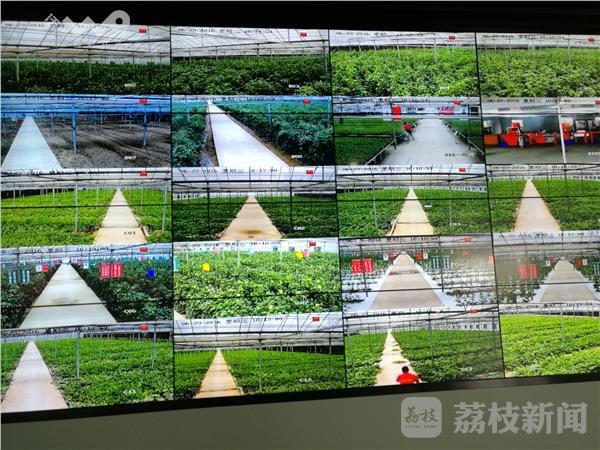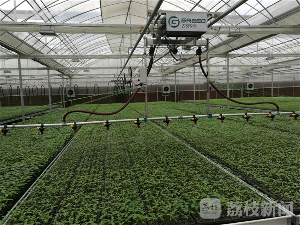 荔枝新闻记者今天在这片广袤的土地上看到,一架架大棚毗邻而立,一眼看不到头,大棚中间是宽敞的水泥路,里面种植着西瓜、西红柿、辣椒、南瓜等各种时令瓜果蔬菜。在一方薄皮椒秧苗的上方,一台悬挂着无数个喷头的机器正在对秧苗进行喷淋,“它们喝的可都是营养水,我们这里的蔬菜、秧苗种植已经全部实行了机械化,物联网控制温度、湿度、二氧化碳,只需一台电脑,各个大棚、各个种植基地里面的数据看得一清二楚”,港闸区农水局局长黄锦屏介绍。