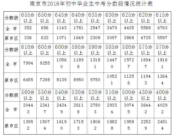 上表中的分数包括 7 门文化课考试成绩(含英语听力口语考试成绩)、体育考试成绩和政策性照顾加分。浦口区、江宁区、六合区、溧水区、高淳区的分数段情况,由区招生办向本区考生公布。