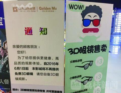 荔枝新闻记者来到了位于吾悦广场的橙天嘉禾影城。刚进影城大厅,记者就看到影城门口的显眼处就贴有告示:为了提供更健康、为生的观影体验,自2016年6月1日起,本影城不再免费提供3D眼镜,请您自备3D眼镜观影。