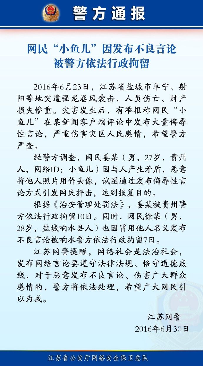 6月30日上午,江苏省公安厅网络安全保卫总队官方微博“江苏网警”通报称,经过警方调查,“小鱼儿”系贵州网友姜某,男性,今年27岁。通报中称,姜某因与他人产生矛盾,故使用他人照片作为头像,试图通过“发布侮辱性言论引发网友抨击”的方式,达到报复目的。