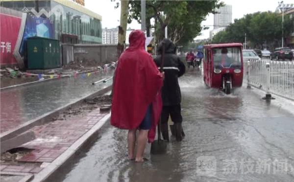 据现场参与疏通积水的张师傅介绍,她们是从早上八点就过来了,当时八点左右雨量较大多处都发生积水,防汛人员全部上街对路面积水进行清除,由于当时雨量较大积水无法迅速排出只能采用人工作业。