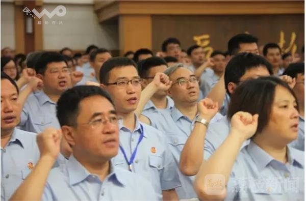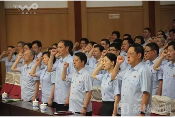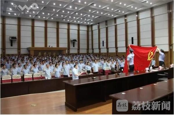 “我志愿加入中国共产党,拥护党的纲领,遵守党的章程,履行党员义务……为共产主义奋斗终身,随时准备为党和人民牺牲一切,永不叛党。”7月1日上午,江苏省法院大法庭,干警们全体起立,面对鲜红的党旗,举起右手握拳过肩,齐声诵读入党誓词。