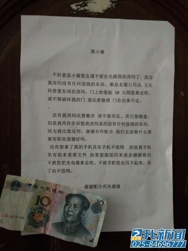 6月30日下午在江北,一家群租房看到在一间房门上有一张字条,仔细一看,好另类,原来是给小偷留的,究竟是为了啥?真有这样的好事?由于此房间门锁着,边上一男子告诉我说:这是群租房,以前这里经常被偷,所以这间屋子主人在门上留了字条,希望小偷不要进屋。