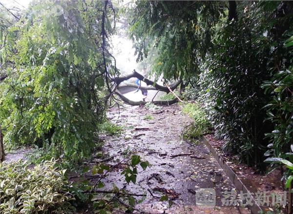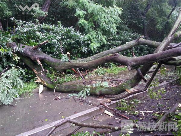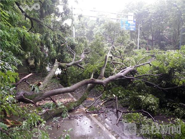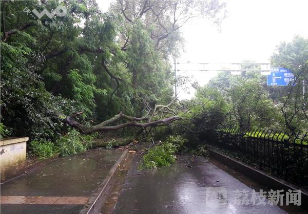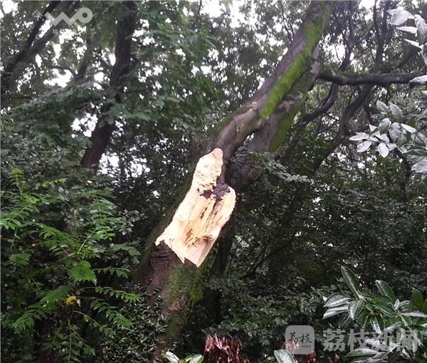 7月3日清晨六点多,南京持续大雨,雨水短时间大量集中在树叶树干上,导致玄武区樱花路紫金山一侧一棵高大朴树的一个大的树叉承受不住重力,直接断裂倒地。因事发清晨,过往人员车辆少,所以没有人员车辆受损。