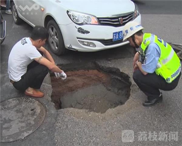 路面塌陷有2平方米,深有1米,小轿车一侧前轮陷在坑内。由于事发路口人流和车辆较多,警方在现场疏导交通,防止发生二次事故。车主刘先生说,当时他正准备右拐弯,车子突然下沉,把他吓得不轻赶紧下车,只见路面塌陷前车轮陷进坑内。好在只是有惊无险,人没受伤。市政人员找来拖车,把被陷轿车拽出并拖走。工作人员表示,连日阴雨,窨井内的积水把路面下的地基掏空,车子碾压砸成塌陷。他们将全力抢修,争取在晚高峰前施工完毕。