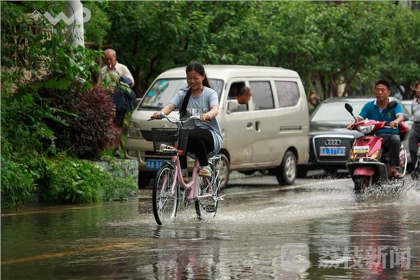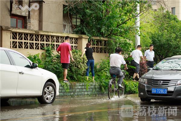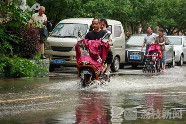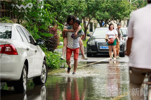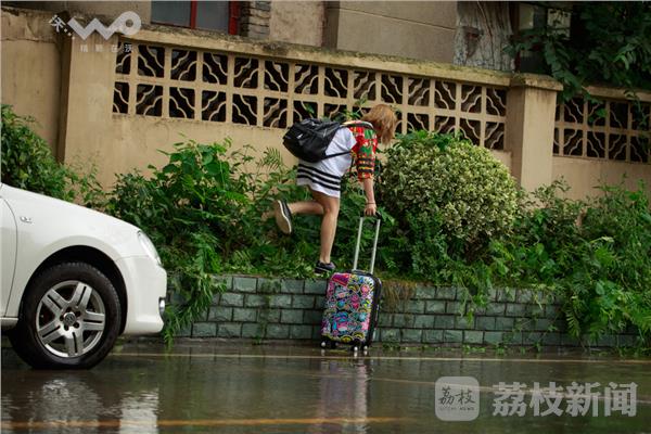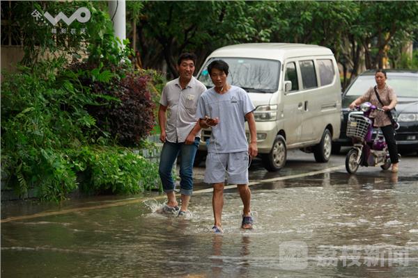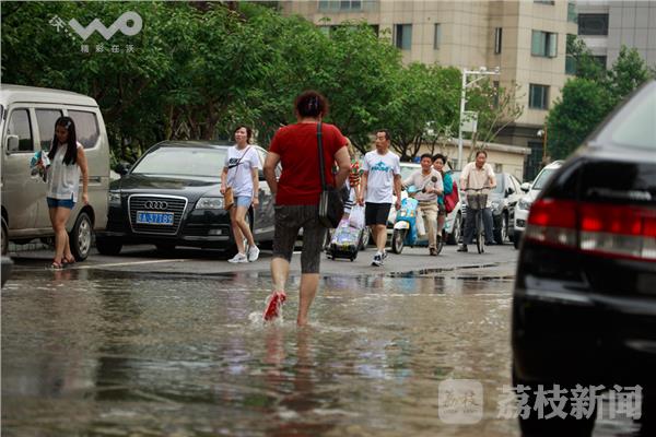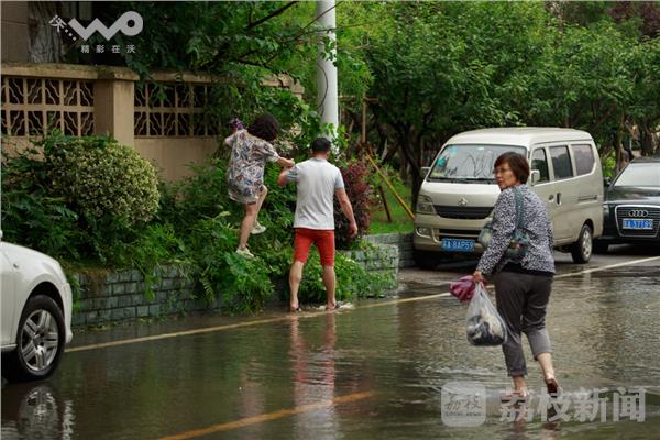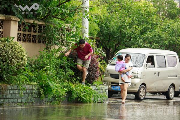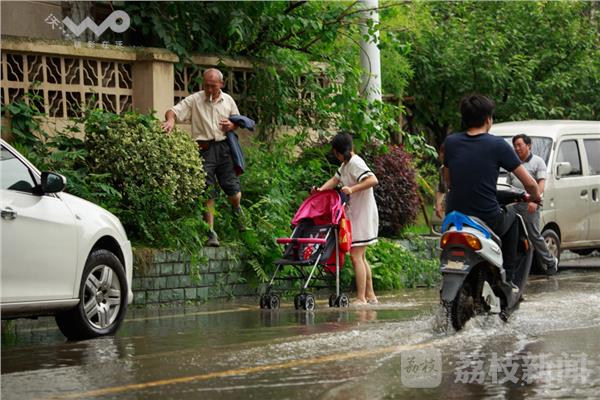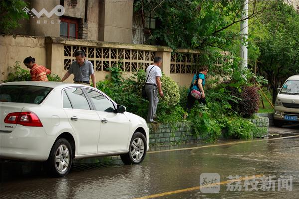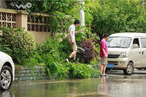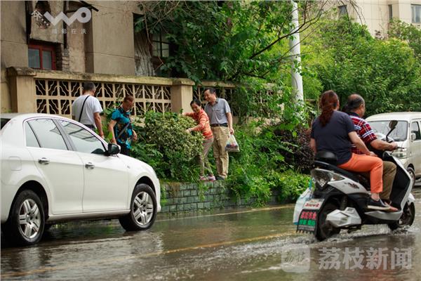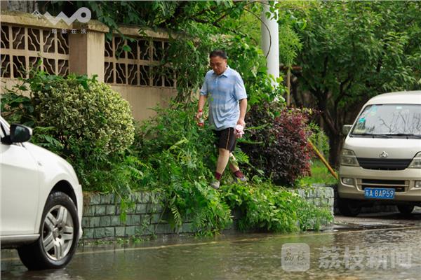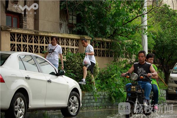 荔枝新闻记者看到码头附近的江边路一处路面积水很深,不穿雨靴的行人根本无法通过,但没有其它可以选择的道路。行人有的爬上路边花坛,有的脱鞋趟水通过,困难重重。内涝对住在长江峰景小区的居民影响最大。积水正好位于该小区门口北侧,居民出门影响不小。