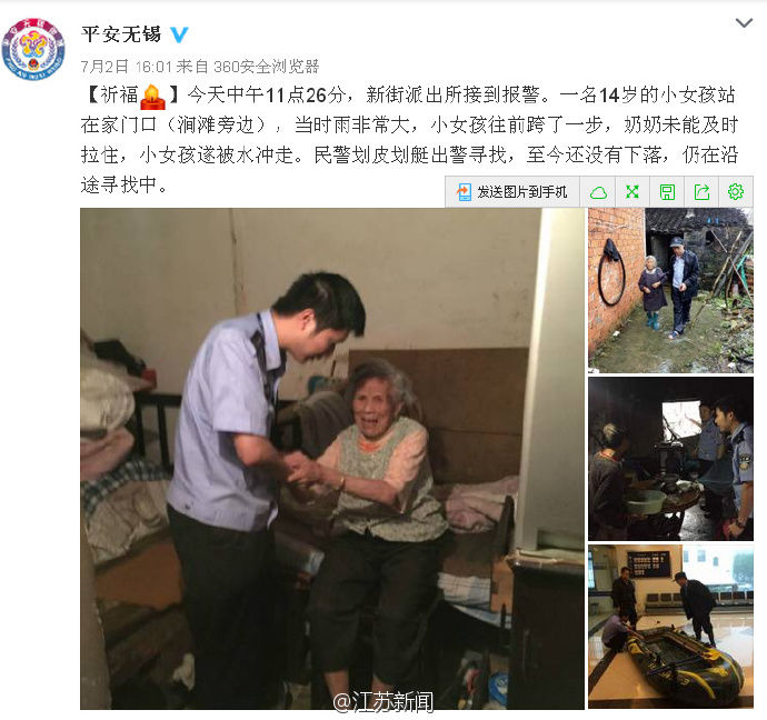 此前报道:【宜兴一14岁女孩家门口被水冲走 至今下落不明】这一轮强降雨使宜兴遭遇17年最大的水灾。昨天中午,在无锡宜兴新街铜山板栗园,一名14岁的小女孩跟随奶奶外出途中不慎滑倒,奶奶未能及时拉住,小女孩落入水中被冲走。经搜寻,至今仍未发现落水女孩。目前事故具体原因还在调查中。愿平安无事,祈祷!